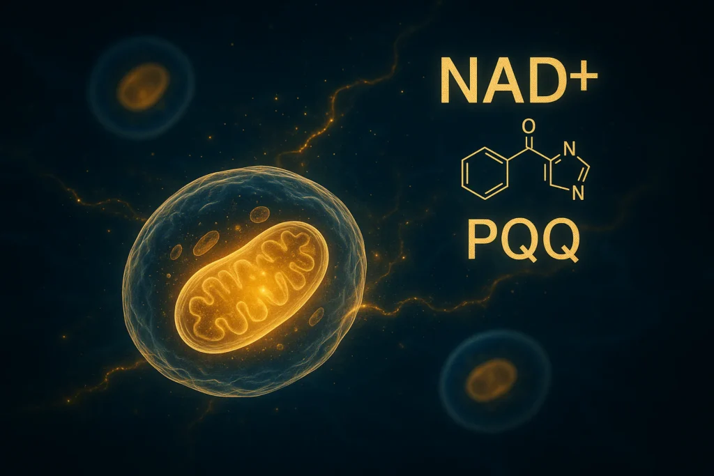 NAD+ (Nicotinamide Adenine Dinucleotide) plays a critical role in cellular metabolism, helping repair DNA and fuel energy processes, while PQQ (Pyrroloquinoline Quinone) encourages mitochondrial biogenesis – building new mitochondria for brain and body.